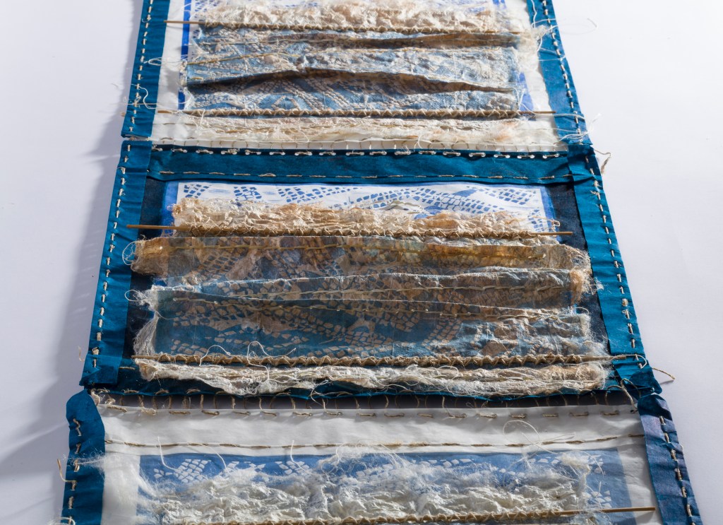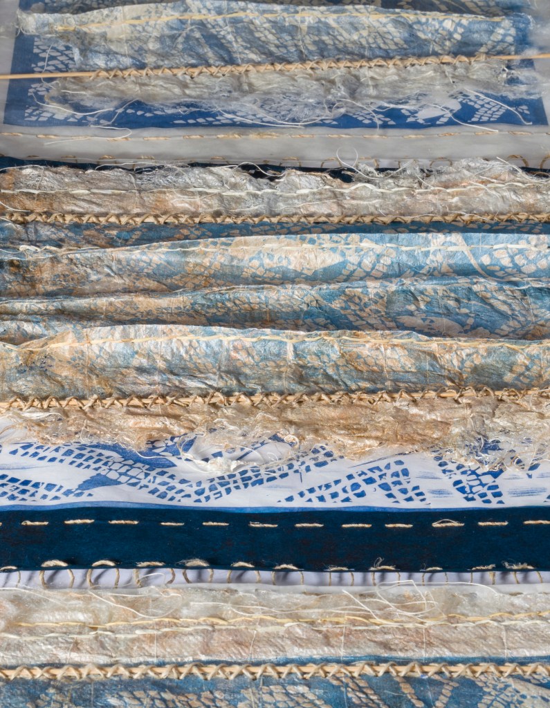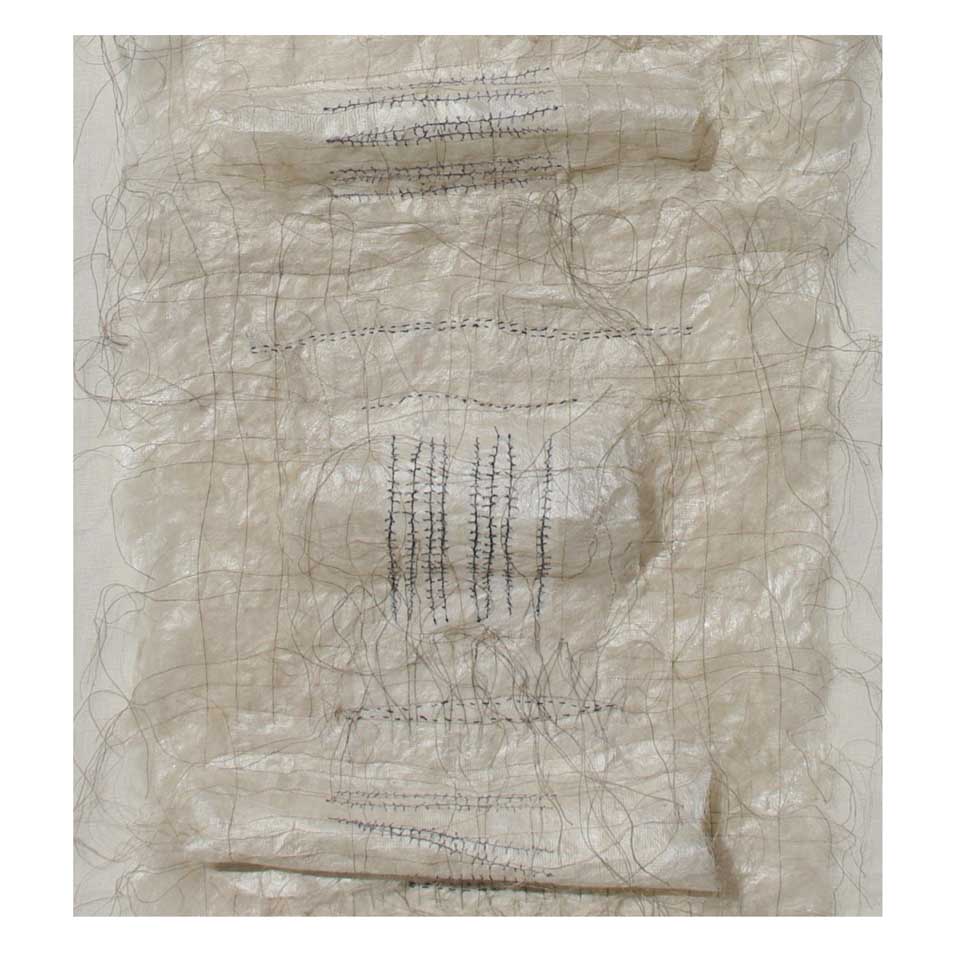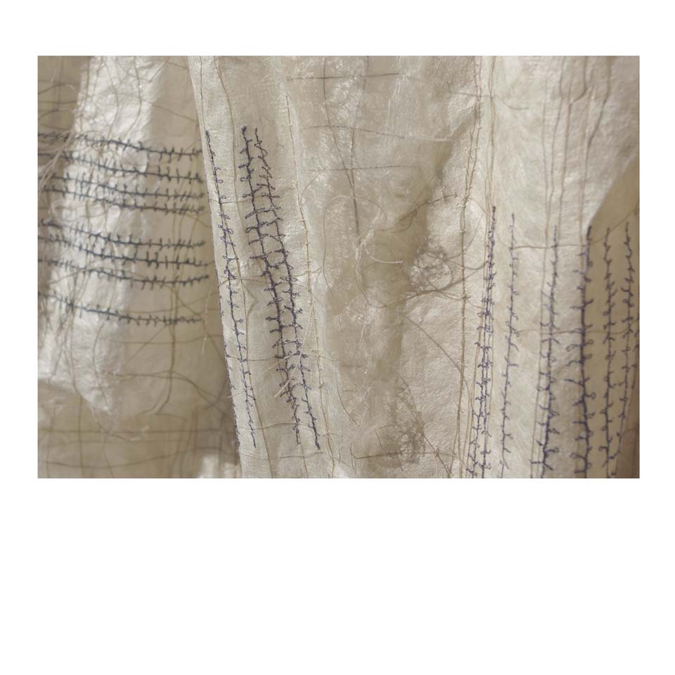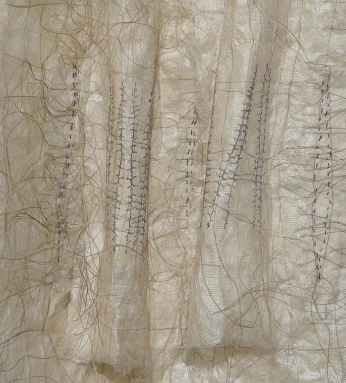 Parchment 2018 constructed from hand made silk papers (mulberry silk fibres) inlaid with linen thread formed using CMC paste between synthetic mesh. Layered collage techniques. Hand and machine stitching. Relief forms internal structure formed over Lutrador. Three layers: silk paper structure, under layer of scrim, mounted onto either off white upholstery vilene or thick handmade or water colour paper.hand made silk paper surfaces, digital and hand stitching. Dimensions 170cm x 62cm