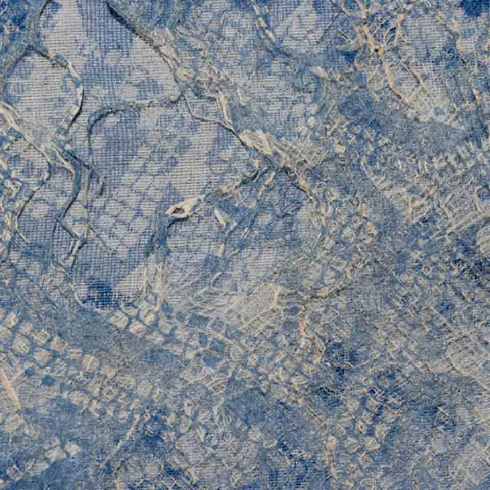 Framed artwork. Tissutex paper overlaid with distressed scrim. Printed with oil based inks from a laser etched wood block .