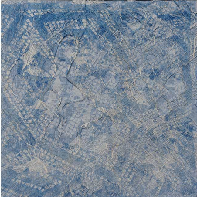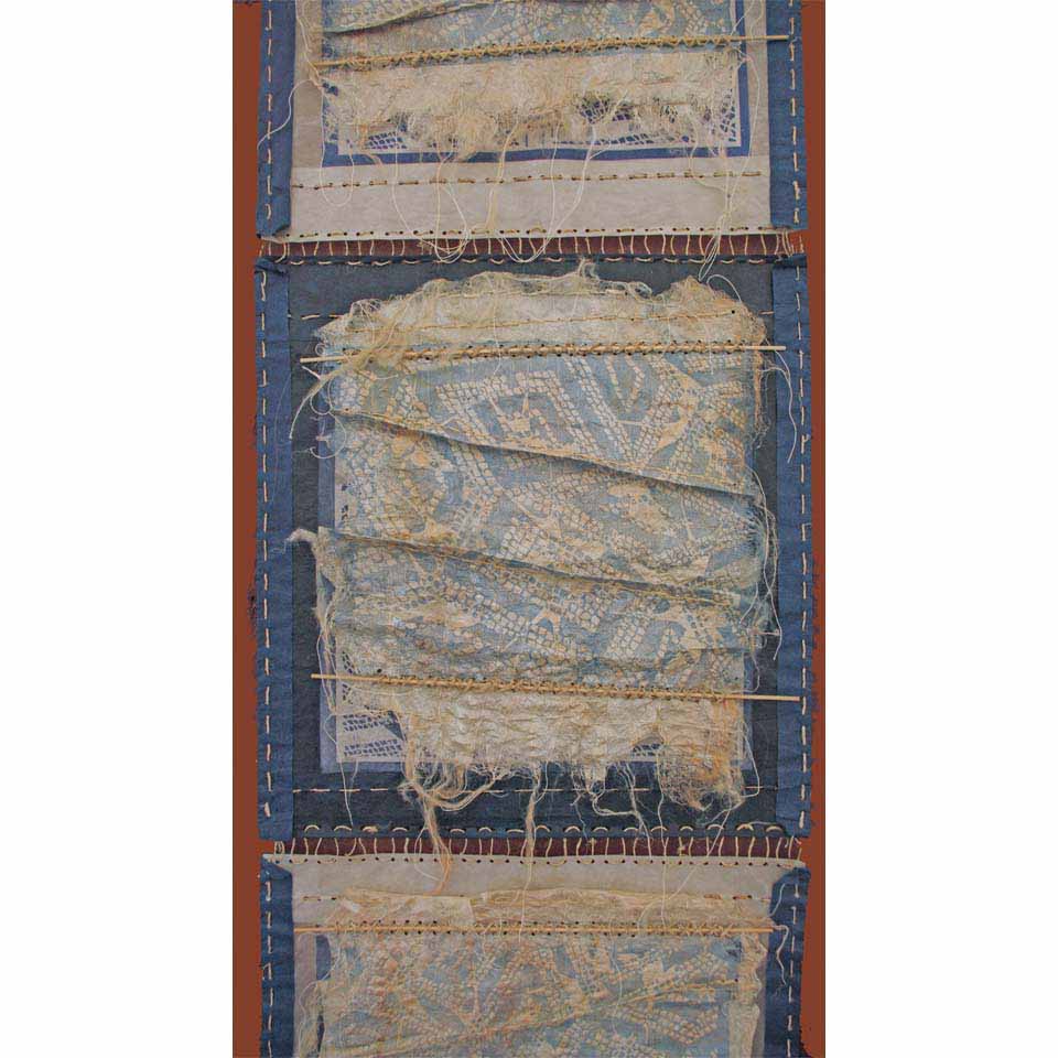 Constructed over a period of time (2013 -2015) this final version combines digital technology (laser etched wood print blocks) with handmade and hand dyed and hand printed silk papers and Tissutex papers, with hand stitching and hand wrapping in paper yarns. Mounted on a piece of bark cloth. A reference to sails and overseas journeys.